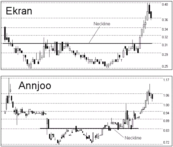 The Double bottoms formation is a minor image of the double top pattern. This is the reversal pattern whereby a bottom is formed on high volume, followed by rally of at least fifteen percent, subsequently followed by a second bottom on lower volume. Bottoms should be at least a month apart, and the reversal is confirmed when second rally crosses the peak of the first rally. The neckline is a strong resistance for the price level, but when the price penetrated it, the BUY signal is confirmed. Examples of Double Bottoms: