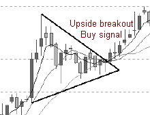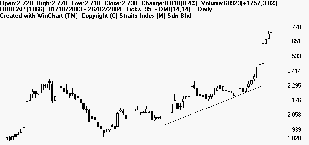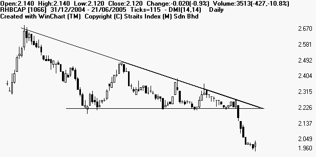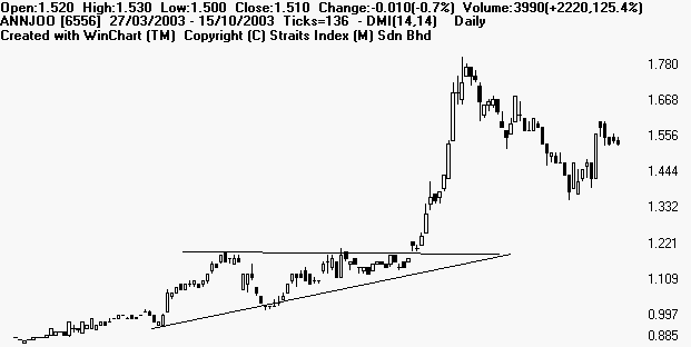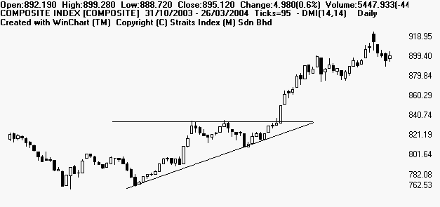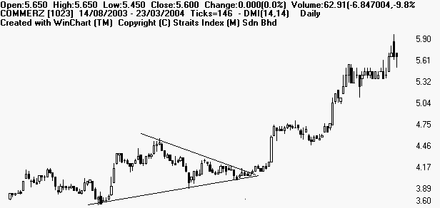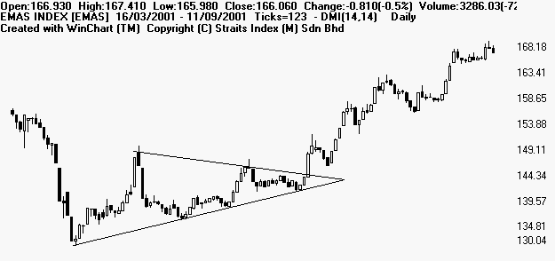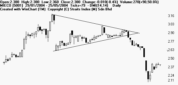 Symmetrical triangle is a period of sideways congestion whereby the series of tops fail to meet the highs of the previous top and a series of bottoms fail to reach the lows of the previous bottom. Lines connecting the tops and bottoms should converge if extended to the left. This pattern represent a struggle between buyers and sellers, the resolution of which is normally expected to be to the direction of the side of the steepest angle up or down. Symmetrical triangle indicate that buyers and sellers are equally strong and the pattern may be resolved in either direction. A BUY signal is given when the price breaks above the top edge of the triangle, and a SELL signal if it breaks below the bottom edge. The breakout must be accompanied by a rise in volume. Examples of Symmetrical Triangles: Mieco [5001] Emas Index