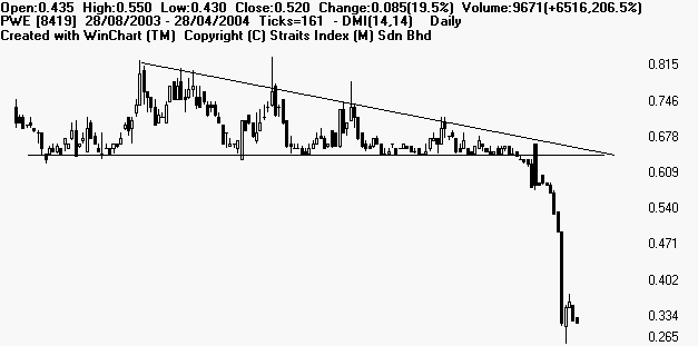 Descending Triangle: Descending triangle is a bearish manifestation of the right angle triangle, whereby connecting the price bottoms during a period to a bear market when some investors recognize that the market is overvalued, and begin to sell their holdings. Tends to be displayed in rallies as volume increases are less than previous rallies. Descending triangle is manifested in the downward slant of the top edge of the triangle, showing that the buyers are giving up at progressively lower levels. A SELL signal is confirmed when the price works its way into the apex of the triangle, it can be expected to break down out of the triangle. The downtrend breakout must be accompanied by heavy volume to validate the formation. Conversely, a BUY signal is confirmed when the price downside breakout at the apex of the descending triangle. Examples of Descending Triangles: PWE [8419]